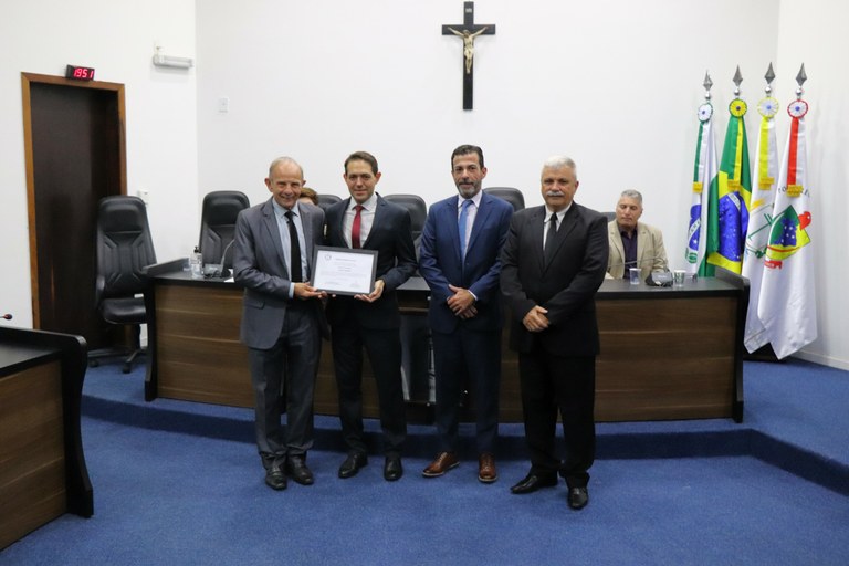 Na noite de sexta-feira (28), a Câmara Municipal realizou a solenidade de entrega da Moção de Aplausos à Banda Ebenézer, proposta pelo ex-vereador Alberto Schereda, no ano de 2017. A Moção é uma forma de prestar homenagem ao grupo que completa, em 2024, 70 anos de existência.
