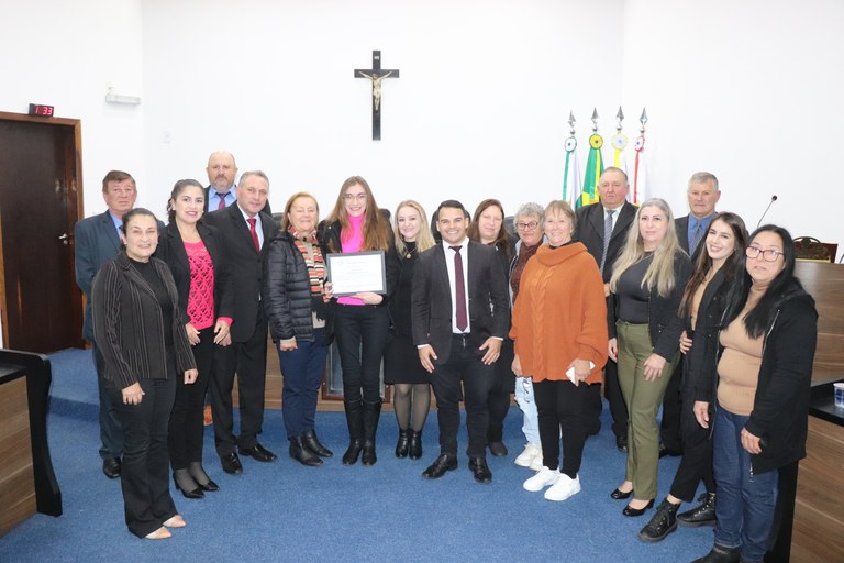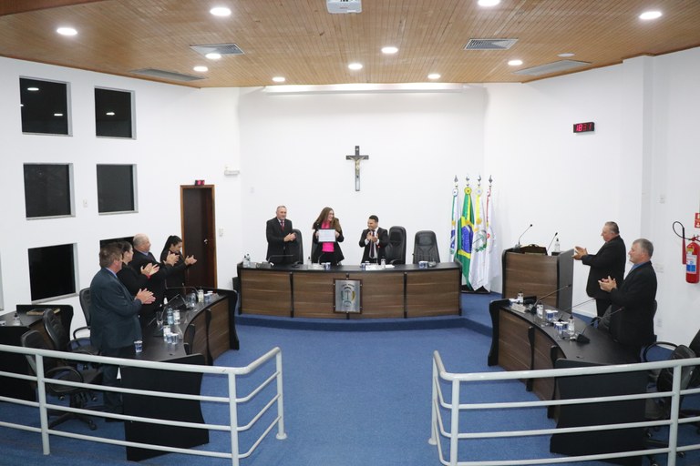 Na noite de terça-feira (04), a Câmara Municipal realizou a solenidade de entrega da Moção de Aplausos nº 001/2024 à profª Cibelli Batista Belo, pelo recebimento do Prêmio “Educador Transformador” do SEBRAE. A homenagem foi proposta pelos vereadores Helio de Mello, Alcides Cezar Pinto, Teresinha Miranda Veres e Vera Maria Gabardo e foi aprovada por unanimidade de votos.